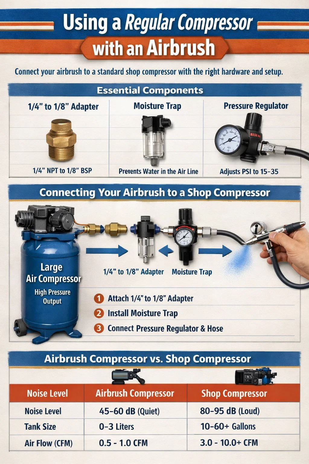 أنت بالتأكيد يمكن تشغيل البخاخة باستخدام ضاغط متجر عادي أو مرآب بشرط أن يكون لديك المحولات الصحيحة وطريقة لتنظيم الضغط. في حين أن ضواغط البخاخة المخصصة مصممة للتشغيل الهادئ ومنخفض الضغط، فإن الضاغط القياسي واسع النطاق أكثر من قادر على توفير تدفق الهواء اللازم. في الواقع، يفضل العديد من الرسامين المحترفين الضواغط العادية لأنها توفر صهاريج التخزين الكبيرة تيارًا ثابتًا تمامًا من الهواء وخاليًا من النبض غالبًا ما تكافح نماذج البخاخة الصغيرة بدون خزان من أجل مطابقتها.