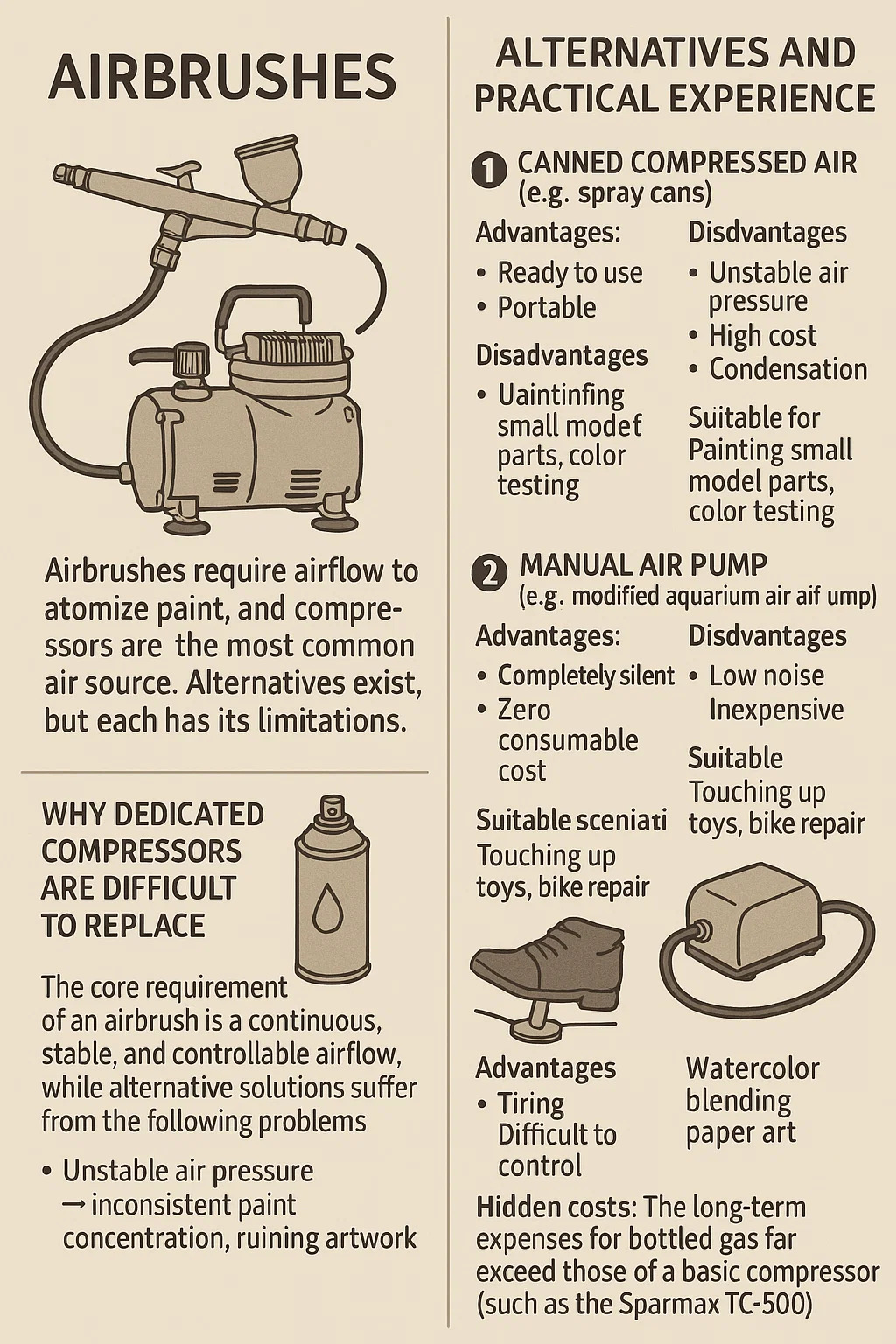 البخاخات تتطلب تدفق الهواء لتفتيت الطلاء، والضواغط هي مصدر الهواء الأكثر شيوعًا. البدائل موجودة، ولكن لكل منها حدوده.