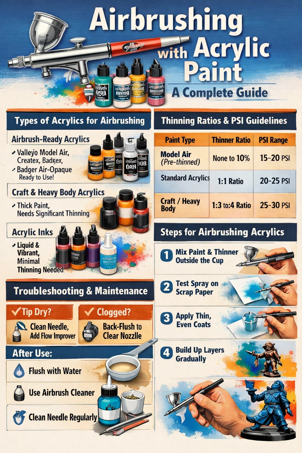 باستخدام الماء المقطر مقبول للتخفيف الأساسي، ولكنه مخصص البخاخة أرق متفوق. تحتوي هذه المخففات على "محسنات التدفق" و"مثبطات" تعمل على إبطاء وقت التجفيف. وهذا أمر حيوي لأن الأكريليك يجف بالتبخر؛ وبدون مثبط، يمكن للطلاء أن يجف على طرف الإبرة قبل أن يغادر البخاخة، وهي ظاهرة تعرف باسم "طرف جاف."