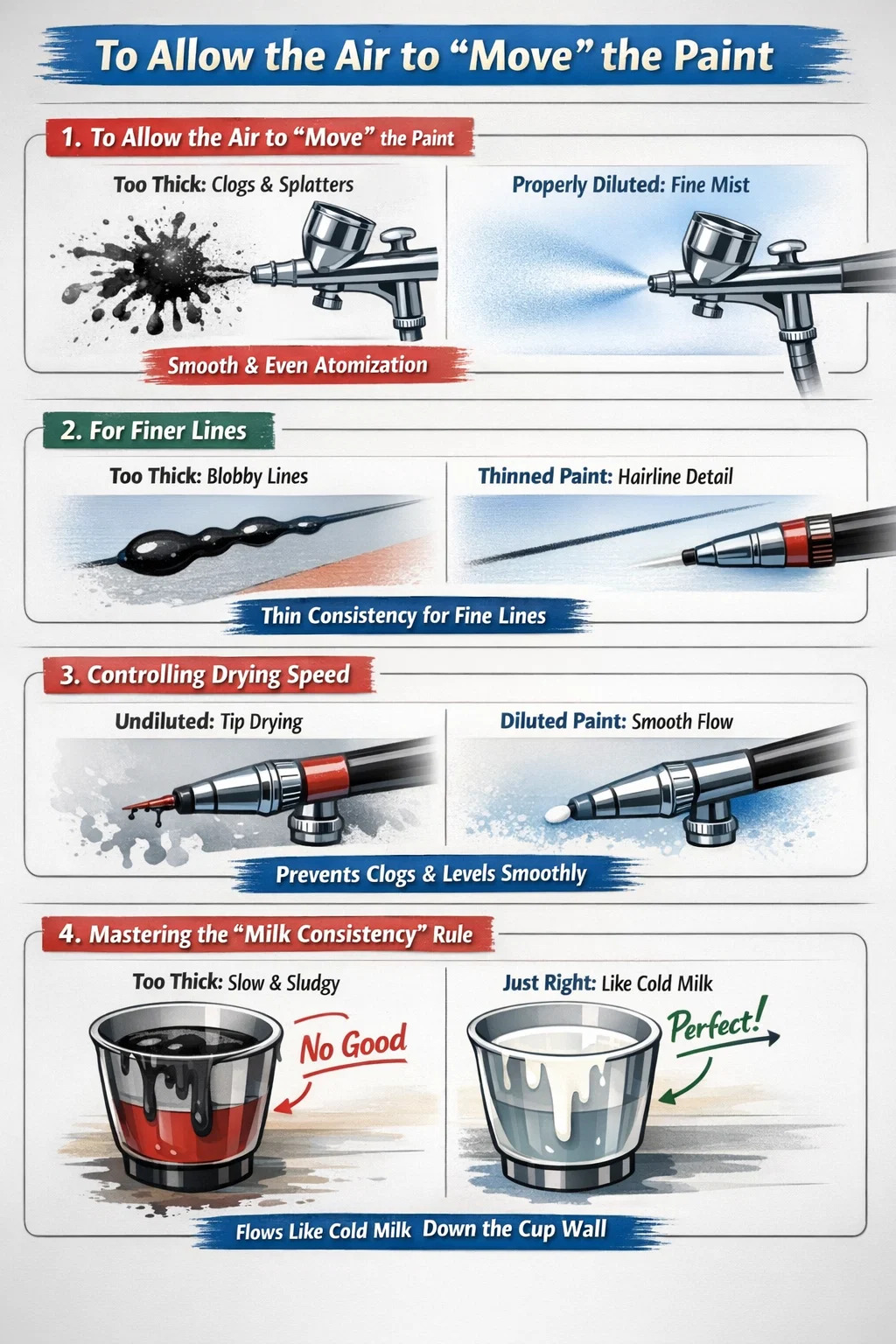 حتى الدهانات التي تحمل علامة "Airbrush Ready" غالبًا ما تتطلب تعديلات طفيفة بناءً على درجة حرارة اليوم وضغط الهواء والتأثير المطلوب.